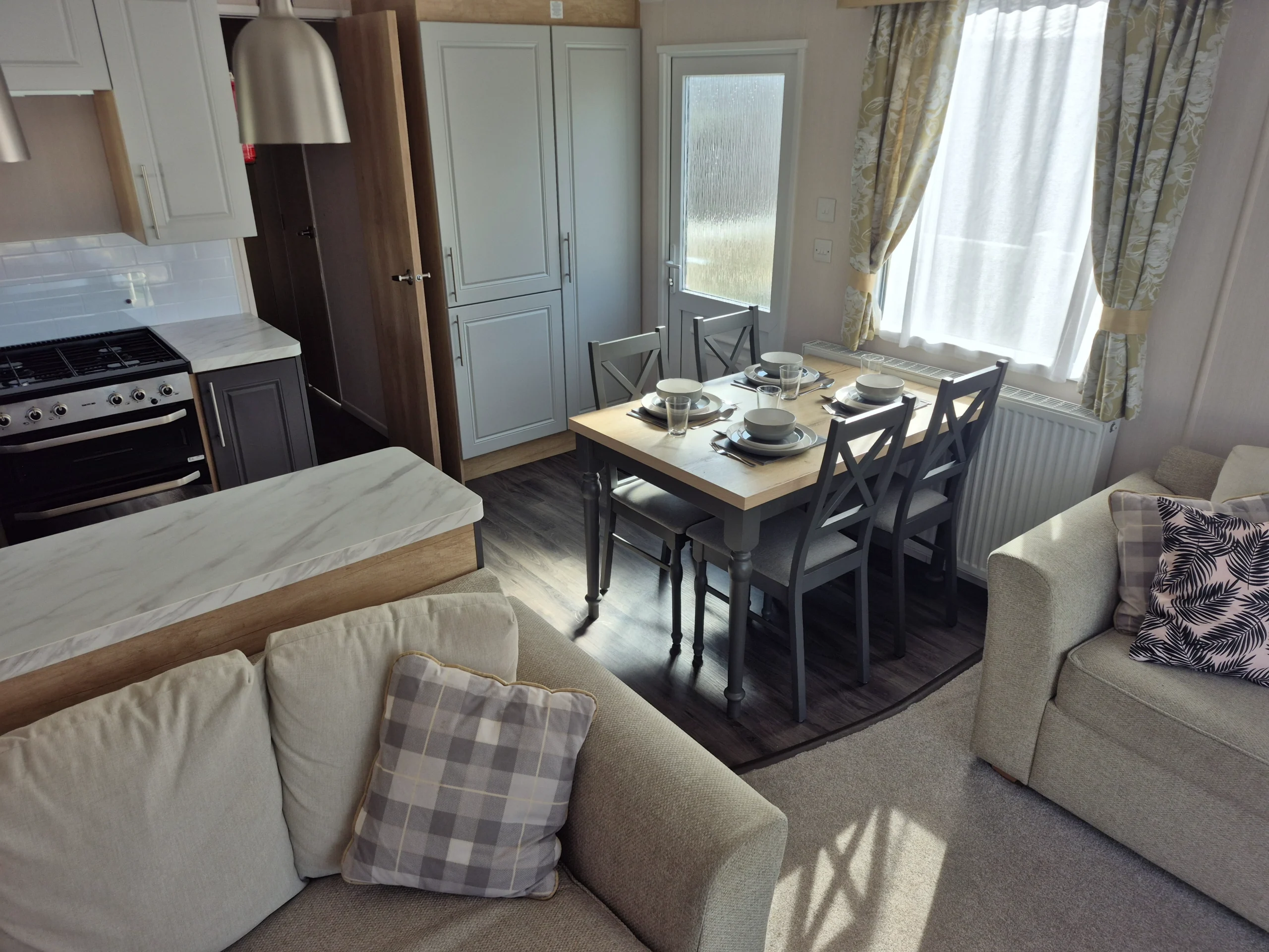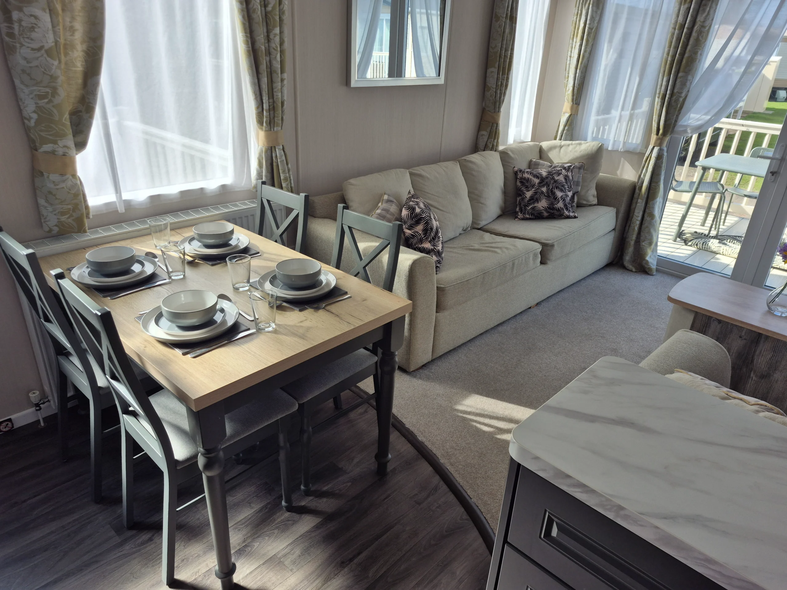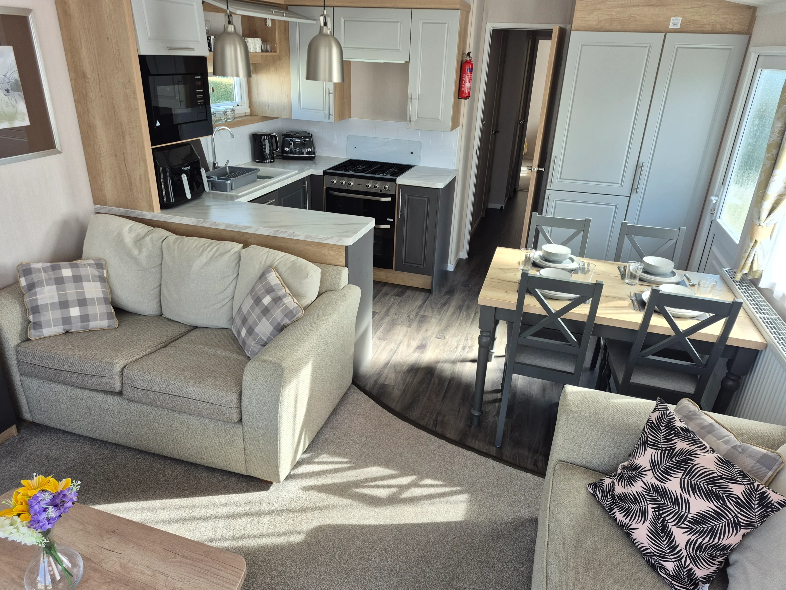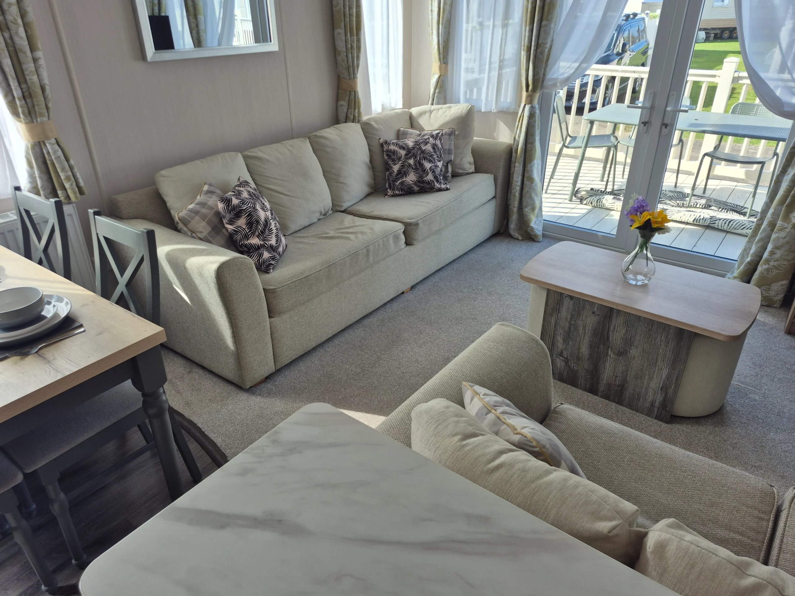 In the living space there’s a modern kitchen complete with built in fridge/freezer, microwave, air fryer and dish washer.. In the lounge area there are 2 large free standing sofas with a built in occasional pull-out bed, together with a dining table and chairs – ideal for big family mealtimes.