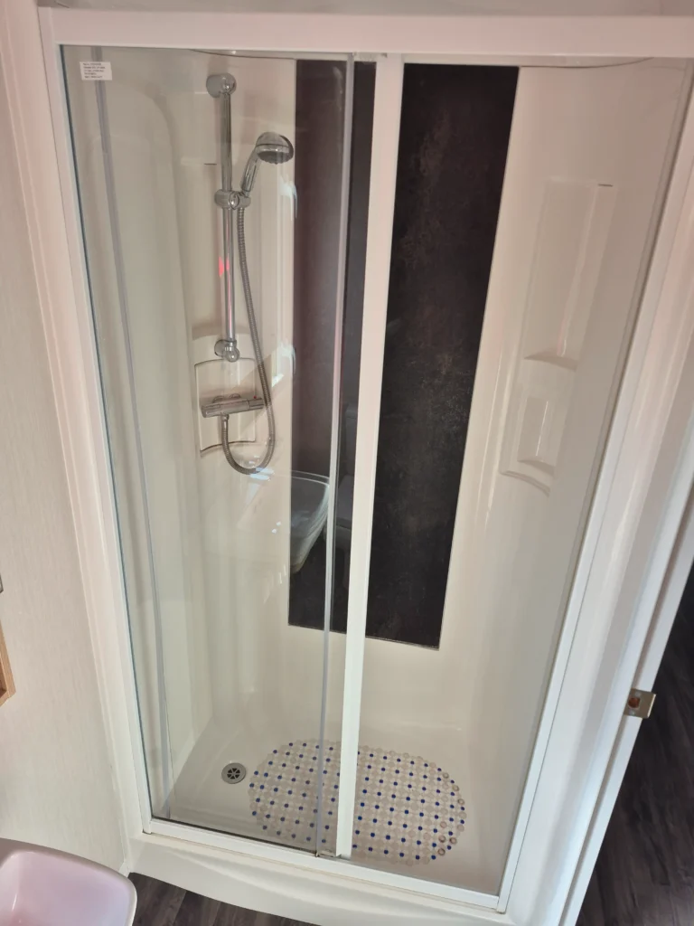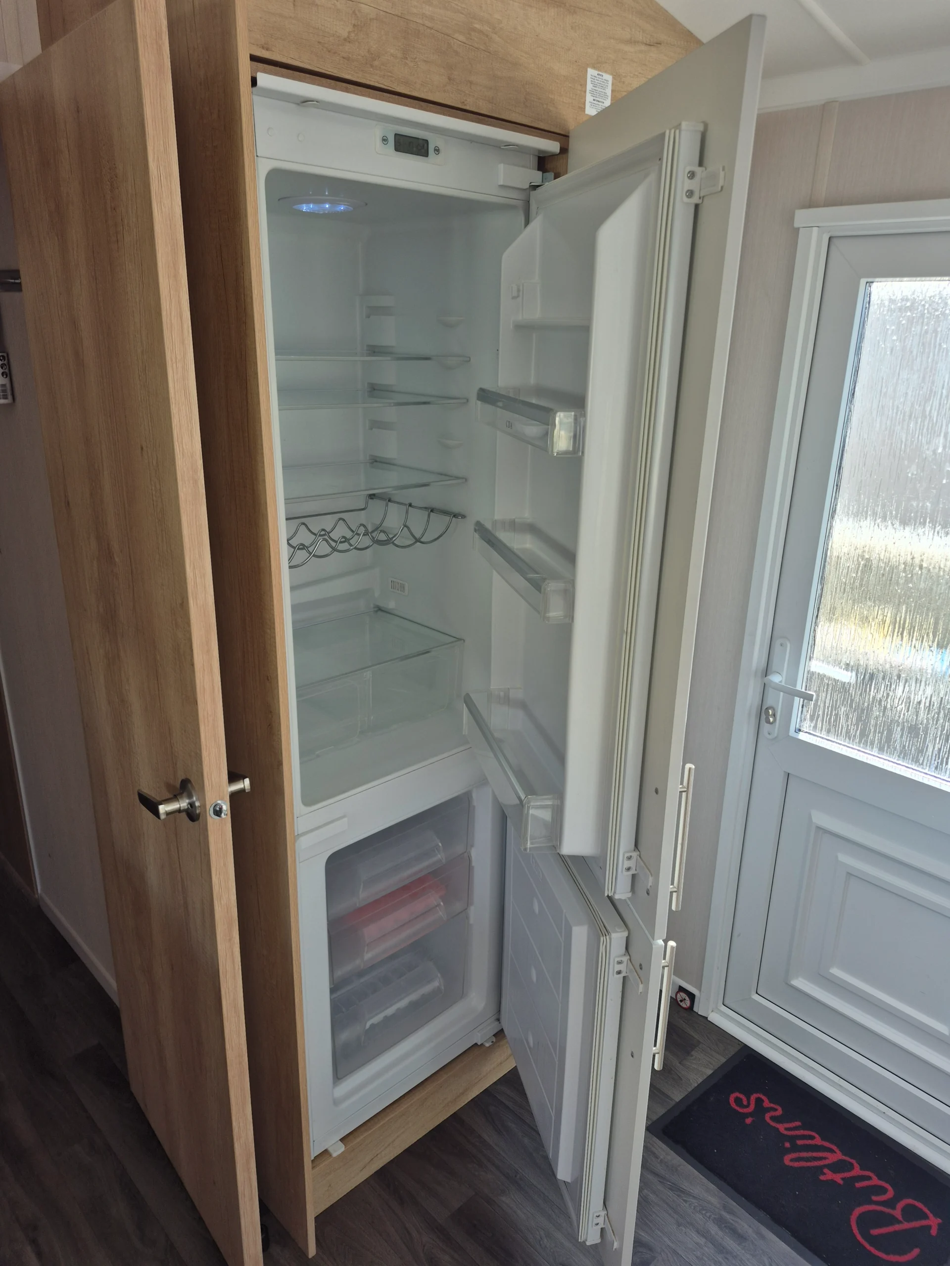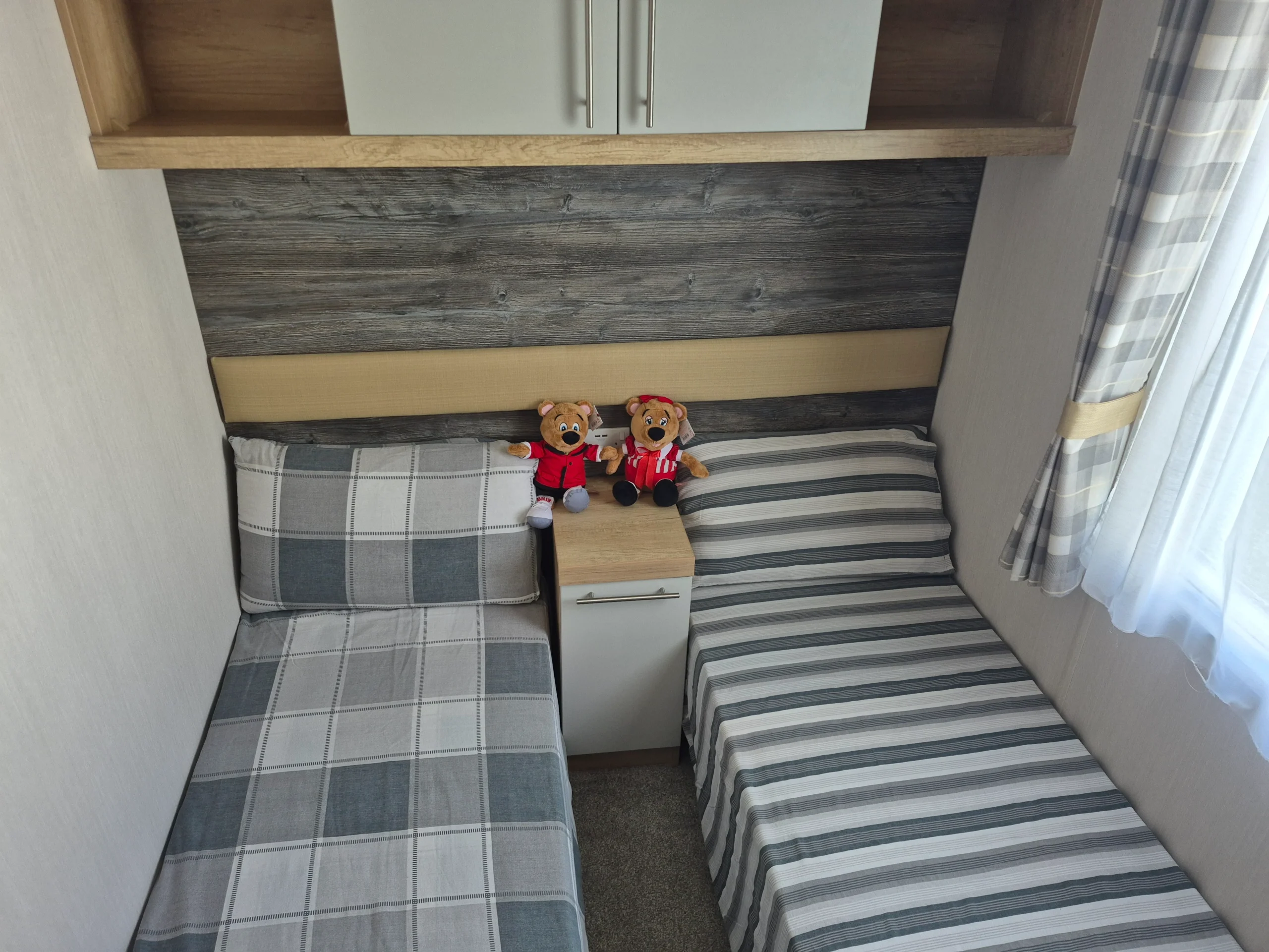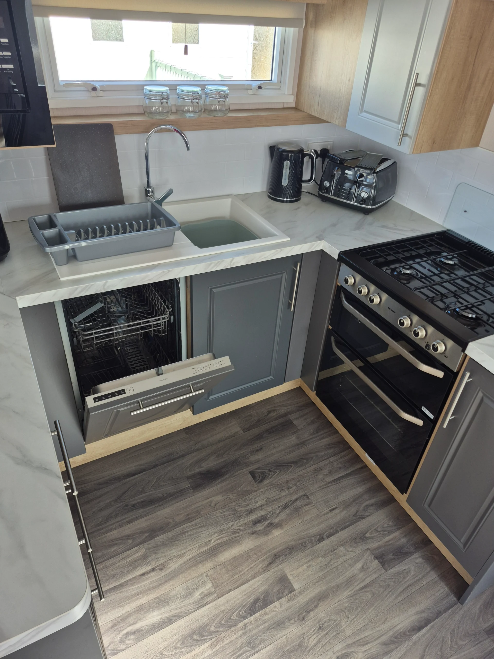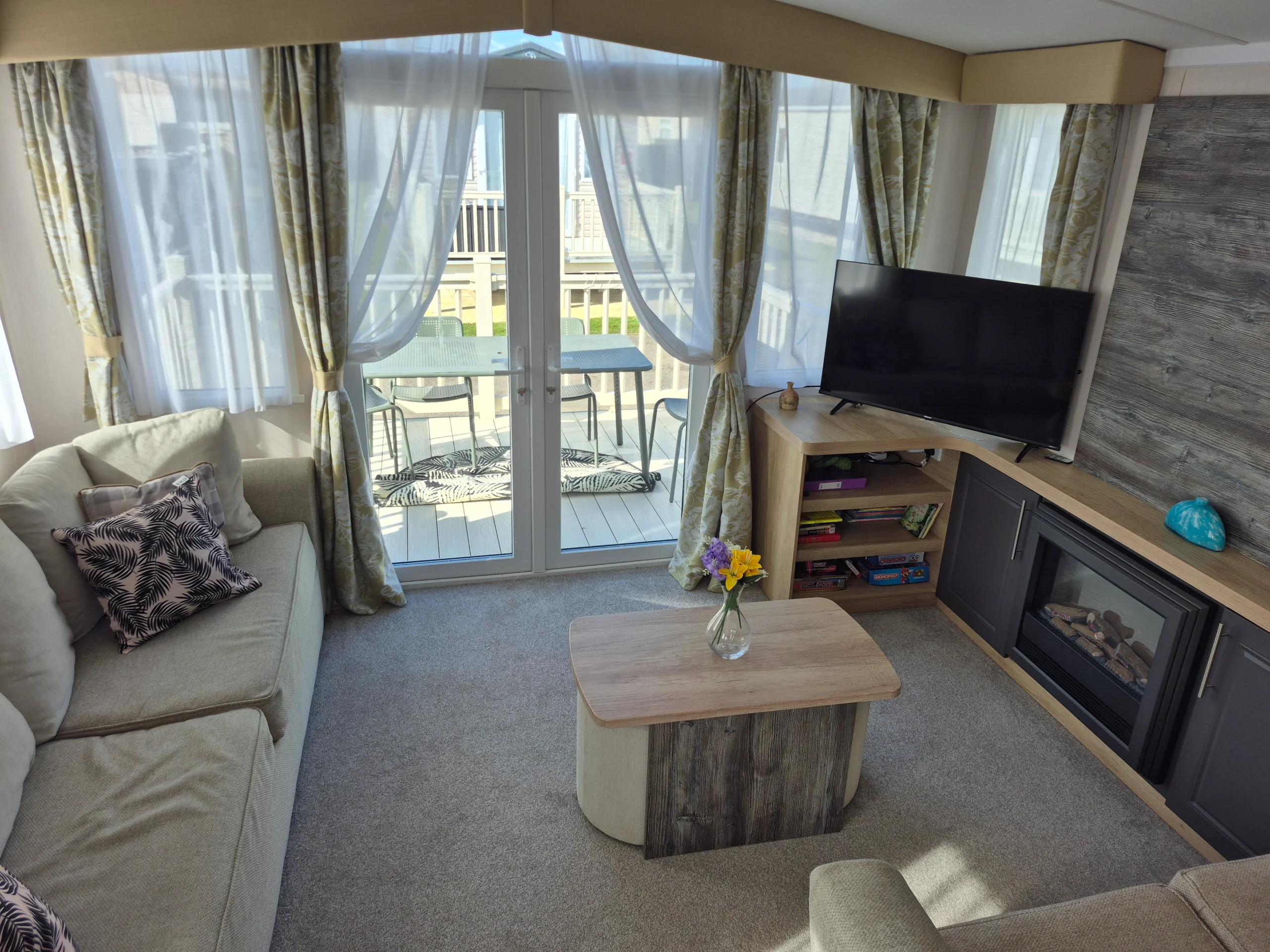 In the living space there’s a modern kitchen complete with built in fridge/freezer, microwave, air fryer and dish washer.. In the lounge area there are 2 large free standing sofas with a built in occasional pull-out bed, together with a dining table and chairs – ideal for big family mealtimes.