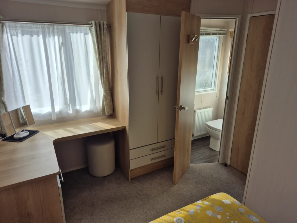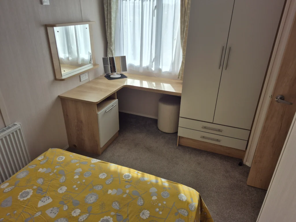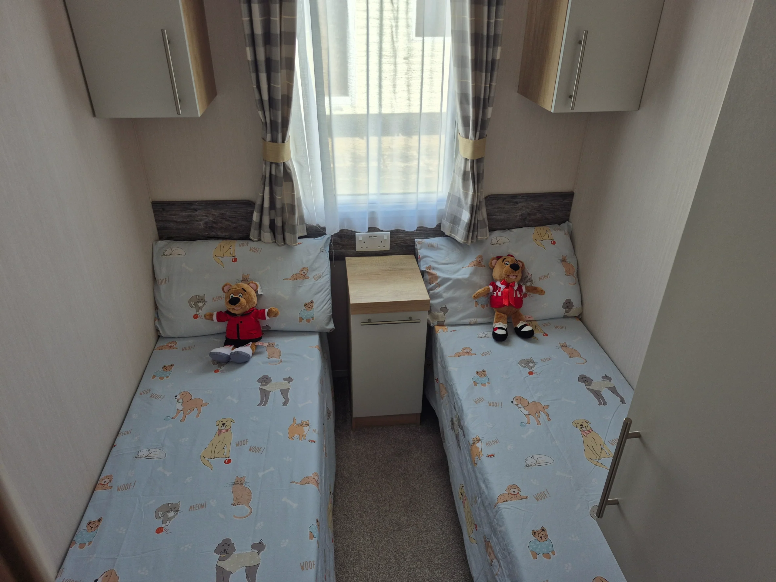 It has central heating and double glazing so is nice and comfortable. Has 3 Bedrooms, and sleeps 8 with 1 large double bedroom, 2 twin bedrooms and a double pull out bed in the lounge..